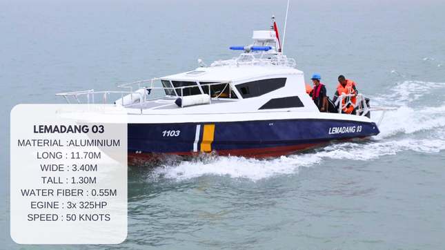 kecepatan maksimum hingga 50 knots dengan tiga mesin 325 HP, yang merupakan performa luar biasa untuk kapal dengan ukurannya. Secara keseluruhan, kombinasi bodi ramping dan bobot yang ringan memungkinkan Lemadang 03 mencapai kecepatan yang tinggi tanpa mengorbankan stabilitas dan manuverabilitas, menjadikannya pilihan ideal untuk operasi cepat di laut.