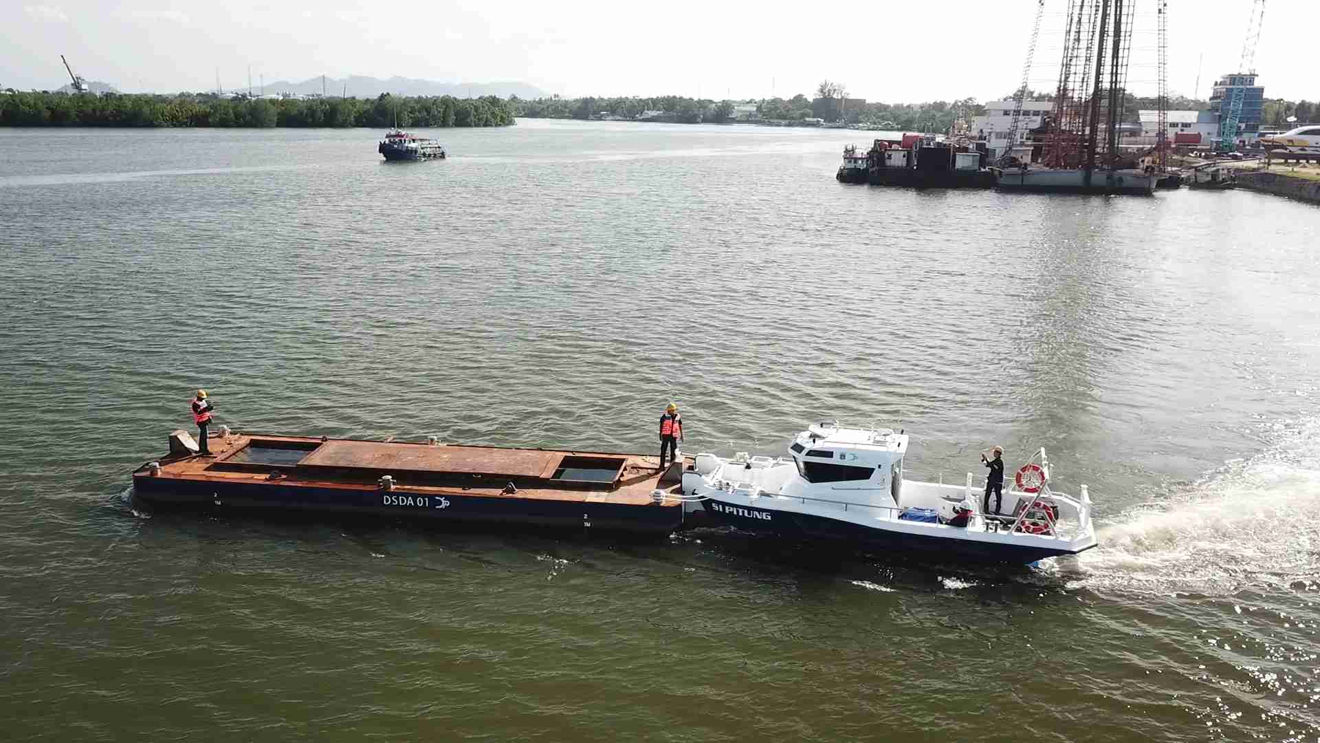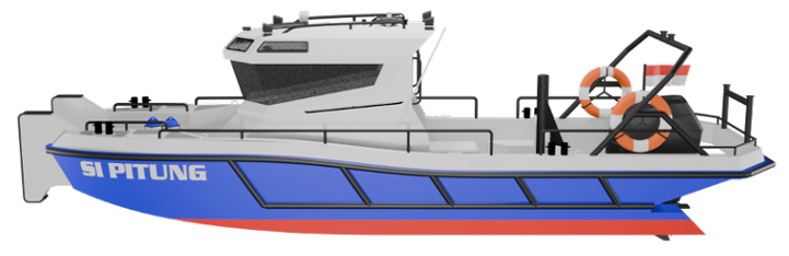 Kapal KM. PUSHBOAT SIPITUNG adalah kapal berbahan aluminium yang ramping dan kuat, dirancang khusus untuk memiliki daya dorong besar dalam operasionalnya, terutama dalam pengangkutan sampah di perairan DKI Jakarta. Dengan panjang 9,35 meter, lebar 2,80 meter, dan tinggi 1,10 meter, kapal ini memiliki draft yang rendah, hanya 0,30 meter, sehingga sangat cocok untuk beroperasi di perairan dangkal yang sering ditemui di wilayah tersebut. Tenaga kapal ini berasal dari satu mesin 200 HP yang memungkinkan mencapai kecepatan hingga 27 knots, memberikan kecepatan dan efisiensi tinggi dalam pekerjaannya. Struktur aluminium pada tubuh kapal memberikan kekuatan sekaligus menjaga bobot tetap ringan, memudahkan manuver serta memberikan ketahanan terhadap korosi, menjadikannya pilihan tepat untuk tugas berat seperti pengangkutan sampah di lingkungan maritim. Dengan desain yang efisien, kapal ini mampu menangani beban berat sambil tetap lincah, menjadikannya alat yang andal untuk mendukung upaya kebersihan dan keberlanjutan lingkungan di wilayah perairan Jakarta.