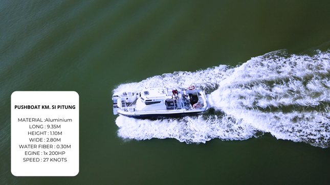 Kapal KM. PUSHBOAT SIPITUNG dengan material aluminium dan berat 15 GT ini memiliki panjang 11,39 meter dan lebar 3,70 meter, serta kedalaman serat air 0,50 meter, menjadikannya ideal untuk manuver di perairan dangkal. Ditenagai oleh dua mesin 150 HP, kapal ini mampu mencapai kecepatan 22 knots (sekitar 40,7 km/jam), sehingga dapat dengan cepat dan efisien membawa pemandu (pilot) ke kapal besar atau sebaliknya. Kecepatan dan ukurannya yang kompak memungkinkan kapal ini untuk menavigasi perairan pelabuhan dengan stabilitas dan ketangkasan, memastikan operasi pemanduan berjalan lancar dan aman.